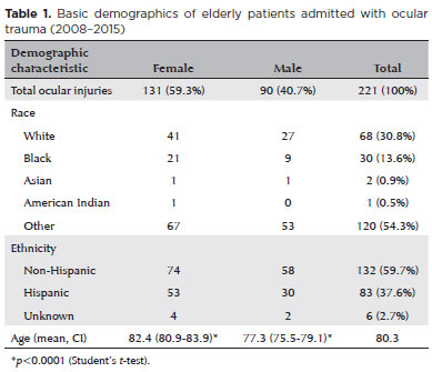 Methods: A retrospective chart review was conducted of patients aged >65 years admitted with ocular injuries that were identified with ICD-9 codes. Tabulated data were analyzed using the Student’s paired t-test, the chi-squared test, and regression analysis using STATA/MP-12 software. Significance was set at p<0.05.