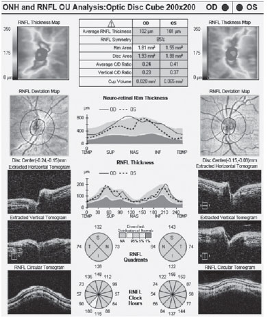 Patients who met the study criteria underwent pharmacological dilation of the pupil and then eyes were scanned with Cirrus HD-OCT system. A 200 × 200 cube optic disc scan and 512 × 128 macular cube scan were obtained. Images with signal strength (an indicator of image quality) <7 were discarded and a new image was obtained until signal strength of at least seven was achieved. The average cpRNFL thickness in each quadrant (superior, temporal, nasal, and inferior) was recorded. No participant showed peripapillary atrophy crossing the scanning circle. All scans were obtained by a single operator with more than one year experience with Cirrus-OCT operation.