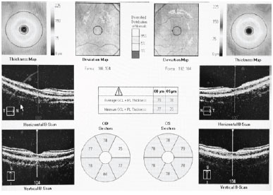 The built-in algorithms of Cirrus HD-OCT (version 6.5.0.772) are capable of automatically identifying the vitreoretinal interface and posterior boundary of the cpRNFL and can subsequently calculate its thickness. The GCA algorithm identifies the outer boundary of the macular RNFL and the outer boundary of the inner plexiform layer (IPL). The difference between the RNFL and the IPL outer boundary segmentation yields the GCIPL thickness(6). The average, minimum, and sectoral (superotemporal, superior, superonasal, inferonasal, inferior, and inferotemporal) GCIPL thicknesses are measured in an elliptical annulus with a vertical outer radius of 2.0 mm and horizontal radius of 2.4 mm.