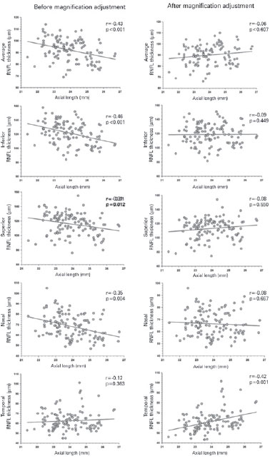 Results: Before the adjustment for ocular magnification, age-adjusted mixed models analysis demonstrated a significant negative correlation between axial length and average circumpapillary retinal nerve fiber layer thickness (r=-0.43, p<0.001), inferior circumpapillary retinal nerve fiber layer thickness (r=-0.46, p<0.001), superior circumpapillary retinal nerve fiber layer thickness (r=-0.31, p<0.05), nasal circumpapillary retinal nerve fiber layer thickness (r=-0.35, p<0.001), and average ganglion cell-inner plexiform layer thickness (r=-0.35, p<0.05). However, after correcting for magnification effect, the results were considerably different, revealing only a positive correlation between axial length and temporal retinal nerve fiber layer thickness (r=0.42, p<0.001). Additionally, we demonstrated a positive correlation between axial length and average ganglion cell-inner plexiform layer thickness (r=0.48, p<0.001). All other correlations were not found to be statistically significant.