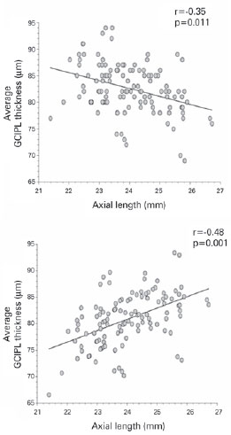 Recently, macular ganglion cell analysis (GCA) was found to be helpful for the early detection of glaucoma. Cirrus HD (high-definition) OCT enables a GCA for the determination of ganglion cell-inner plexiform layer (GCIPL) thickness. Assessment of macular GCIPL thickness and GCA maps have proven to be ideal tests for the early detection of glaucoma(3,4), even in highly myopic patients(5). However, abnormalities have also been observed in non-glaucomatous eyes, especially in those with high myopia(6,7). Myopia is a risk factor for glaucoma, and myopic fundus changes often complicates the diagnosis and management of glaucoma(8-10). Despite OCT being a modern imaging device that measures thickness of cpRNFL and GCIPL, the Cirrus-OCT software is packaged with cpRNFL measurements from a normal population data-base(11), and therefore does not distinguish individuals with moderate or high degrees of myopia, which may lead to an inaccurate diagnosis. In this regard, proper interpretation of the data obtained by Cirrus HD-OCT examination requires an evaluation of the influence of ocular axial length on cpRNFL and GCIPL thickness, which despite an extensive investigation, presents conflicting data in the literature(7,12-14). These disagreements could be attributed to differences in study methodology, such as the OCT instrument used, the adjustment for age or ocular magnification effect, the population evaluated and the method of analysis. Therefore, the aim of the present study was to evaluate the influence of different ocular axial lengths on thickness of cpRNFL and GCIPL and their correlations in healthy eyes, in healthy eyes, considering correction for ocular magnification effect.