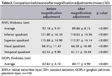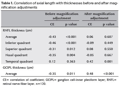 Conclusão: Antes do ajuste para o efeito de magnificação ocular, o comprimento axial estava negativamente correlacionado com a espessura da camada de fibras nervosas da retina peripapilar e das células ganglionares-plexiforme interna medido pelo Cirrus-OCT. Atribuimos esse efeito à magnificação ocular associada a comprimentos axiais maiores, o que foi corrigido com a fórmula de Littman. Mais estudos são necessários para investigar o impacto da correção da magnificação ocular na acurácia diagnóstica do Cirrus-OCT.