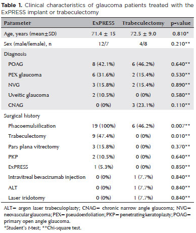 There were no significant differences in age distribution (p=0.81), sex (p=0.21), or type of glaucoma (p>0.1) between the ExPRESS and trabeculectomy groups (Table 1). The main diagnosis was POAG (42.1% and 42.6% in the ExPRESS and trabeculectomy groups, respectively). All patients in the ExPRESS group and six in the trabeculectomy group underwent previous phacoemulsification surgery.
