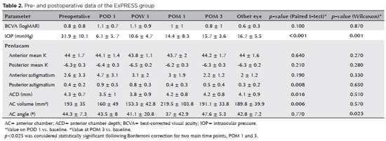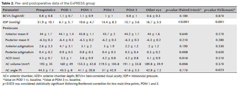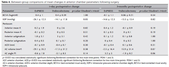 Resultados: A pressão intraocular diminuiu significativamente em relação aos valores iniciais nos dois grupos. A diminuição nos dois grupos foi semelhante no 3º mês pós-operatório (p=0,82). A cirurgia com ExPRESS causou um aumento temporário do astigmatismo posterior da córnea (p=0,008) e uma diminuição temporária da profundidade da câmara anterior (p=0,016) e do volume (p=0,006) no primeiro dia do pós-operatório. Ao final de três meses, esses parâmetros não foram mais estatisticamente significativos (p=0,065, p=0,51 e p=0,57, respectivamente). A trabeculectomia causou um aumento temporário do astigmatismo anterior e posterior da córnea no primeiro dia do pós-operatório (p=0,003 e p=0,005, respectivamente), mas isso não foi observado ao final de 3 meses (p=1,0 e p=1,0, respectivamente). Após 3 meses, tanto o EXPRESS quanto a trabeculectomia mostraram alterações semelhantes nos parâmetros da câmara anterior.