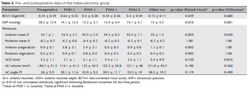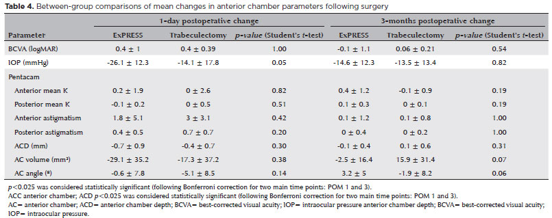 Results: Intraocular pressure decreased significantly from baseline in both groups. The decrease in both groups was similar at postoperative month 3 (p=0.82). ExPRESS surgery caused a transient increase in posterior corneal astigmatism (p=0.008) and a transient decrease in anterior chamber depth (p=0.016) and volume (p=0.006) on postoperative day 1. At postoperative month 3, these parameters were no longer statistically significant (p=0.65, p=0.51, and p=0.57 respectively). Trabeculectomy caused a transient increase in anterior and posterior corneal astigmatism on postoperative day 1 (p=0.003 and p=0.005, respectively), which were not evident at postoperative month 3 (p=1.0 and p=1.0, respectively). At postoperative month 3, both ExPRESS and trabeculectomy showed similar changes in anterior chamber parameters.