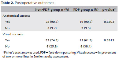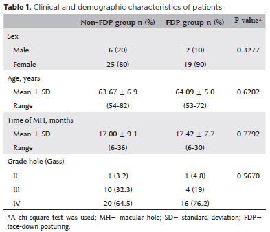 The need for face-down posturing (FDP) remains open to discussion and controversy because eliminating the need for FDP would allow the surgery to be extended to a greater number of patients, particularly those with postural or psychological limitations, with greater postoperative comfort and reduced need for a postoperative rest period(15). Thus, this study was performed to analyze the results of MH surgery using short duration gas (SF6) and the differences in anatomical success rate between patients instructed to maintain FDP orientation and those who were only instructed to avoid the supine position.