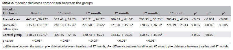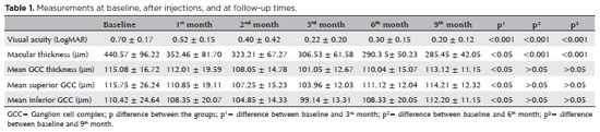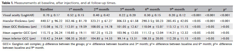 RESULTS: The mean age of the patients in the treatment group was 60 ± 4.38 years. The foveal thicknesses measured using optical coherence tomography decreased significantly from baseline to the third month post-injection (p<0.05). The mean ganglion cell complex thickness was 115.08 ± 16.72 µm before the first injection and 101.05 ± 12.67 µm after the third injection (p<0.05). The mean ganglion cell complex was 110.04 ± 15.07 µm on the sixth month (p>0.05) and 113.12 ± 11.15 µm on the ninth month (p>0.05). We found a significant difference between the patients and the control group in terms of mean ganglion cell complex thickness on the second- and third-months post-injection (p<0.05).