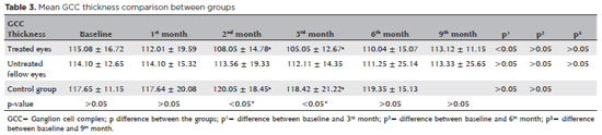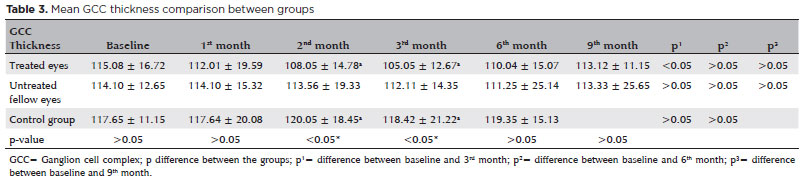 RESULTADOS: A média da idade dos pacientes no grupo de tratamento foi de 60 ± 4,38 anos. As espessuras foveais medidas pela tomografia de coerência óptica diminuiram significativamente desde o início até o terceiro mês após a injeção (p<0,05). A espessura média do complexo de células ganglionares foi de 115,08 ± 16,72 µm antes da primeira injeção e 101,05 ± 12,67 µm após a terceira injeção (p<0,05). A média do complexo de célula ganglionar foi de 110,04 ± 15,07 µm no sexto mês (p>0,05) e 113,12 ± 11,15 µm no nono mês (p>0,05). Encontramos uma diferença significativa entre os pacientes e o grupo controle quanto à média da espessura do complexo de células ganglionares no segundo e terceiro meses após a injeção (p<0,05).