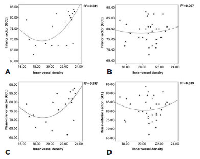 In both groups, there were strong positive correlations between macular thickness map fields (2, 3, and 4) and GCL thickness in all six sectors (Table 2). In group 2, this correlation was also detected in field 5 (Table 3). In group 1 alone, there were positive correlations between the inner vessel density and GCL thickness in sectors S, TI, I, NI, and NS, and there were also positive correlations between complete vessel density and sectors S, I, and NI (Table 4). In group 2, the FAZ diameter was positively correlated with GCL thickness in the TI sector (r=0.56, p=0.01) (Table 5). Changes in GCL thickness in sectors I and NI were partially explained by the inner vessel density (r2=0.32 and r2=0.27, respectively) in group 1, but these relationships were absent in group 2 (Figure 1).