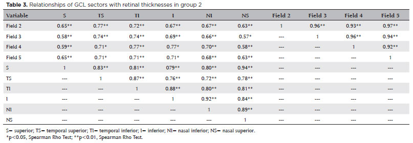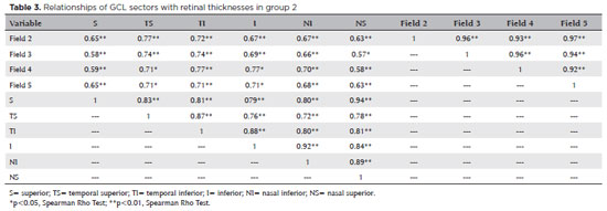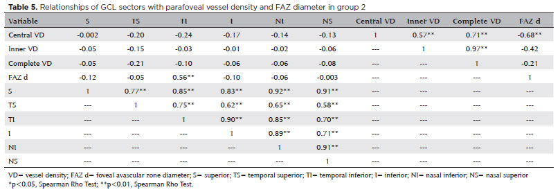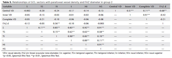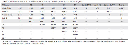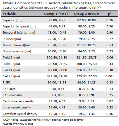 The median values of retinal thickness, parafoveal vessel density, and GCL thickness were compared between groups using the Mann-Whitney U test. Relationships of retinal thickness in fields 2, 3, 4, and 5 of the macular map with parafoveal vessel density and GCL thickness were determined using the Spearman Rho test. A p value <0.05 was considered significant. Statistical analyzes were performed using SPSS for Windows (version 22, IBM Corp., Armonk, NY, USA).