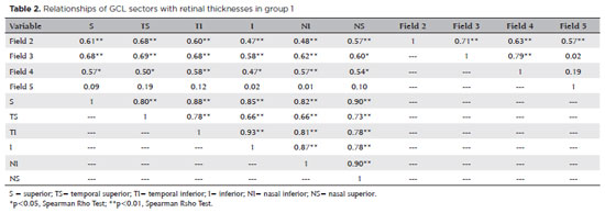 Mean GCL thicknesses are typically greater than 80 µm in non-diabetic individuals(10-12), and these measurements are reproducible and decrease by 0.25 µm/year(12). In diabetic patients without retinopathy, compared with non-diabetic patients, the mean GCL thicknesses were reportedly 1.4(13) and 4.37 µm(14) thinner (p>0.05), and one study reported lower mean GCL thicknesses in the NS (p=0.022) and NI (p=0.042) sectors(15). Another study reported reductions of mean GCL in all sectors of the GCL thickness map (NS, p=0.001; S, p=0.002; TS, p=0.007; NI, p=0.014; I, p=0.07; and TI, p=0.05)(16), and a study in a Latino population revealed a lower mean GCL thickness in diabetic individuals without retinopathy compared with healthy controls(17). Importantly, none of these studies evaluated the relationship between total macular thickness and GCL thickness.