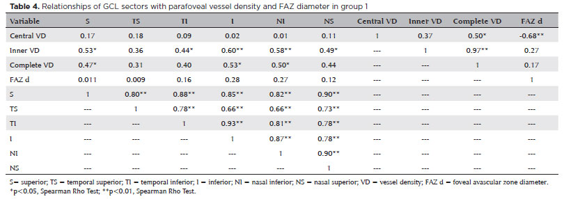 RESULTS: In total, 68 eyes were included in this study: 34 in group 1 and 34 in group 2. Ganglion cell layer thickness did not differ between groups in any sector. There were strong positive correlations between fields 2 (superior parafoveal), 3 (temporal parafoveal), and 4 (inferior parafoveal) of the optical coherence tomography macular thickness map and the ganglion cell layer thickness in all sectors in both groups. Central vessel density mean was lower in diabetic patients. In group 1 alone, thickness changes in the inferior and nasal inferior ganglion cell layer sectors were partially explained by inner vessel density (r2=0.32 and r2=0.27).