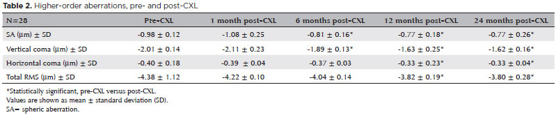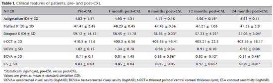 Métodos: O estudo incluiu 28 olhos de 24 pacientes. As acuidades visuais não corrigidas e melhor corrigidas (logMAR), leituras ceratométricas mais planas e íngremes, espessura corneana central no ponto mais fino, aberrações corneanas de mais alta ordem e a sensibilidade ao contraste foram avaliadas antes e em 1, 3, 6, 12 e 24 meses após a realização do do cross-linking.