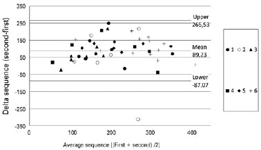 Resultados: Os dados não seguiram uma distribuição normal. Houve melhora da sequência 1 em todos os testes (todos os valores de p<0,05). A soma de todas as pontuações (pontuação total) melhorou da sequência 1 (mediana= 152,50) para a sequência 2 (mediana= 256,00; p<0.001). Não houve correlação entre os valores da sequência delta e as pontuações médias.