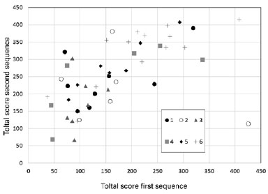 Results: The data did not follow a normal distribution. There were improvements from sequence 1 in all the tests (all p values<0.05). The sum of all scores (total score) improved from sequence 1 (median= 152.50) to sequence 2 (median 256.00; p<0.001). There was no correlation between the delta sequence values and the average scores.