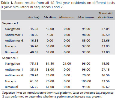Methods: This was a multicenter cross-sectional study of all candidates who were accepted as first-year residents at one of six ophthalmology teaching institutions. Residents were subjected to two identical series of standardized, reproducible dexterity tests using virtual reality equipment (Eyesi®): “sequence 1” and “sequence 2.” Each sequence consisted of five difficulty levels that were assessed using a proprietary scoring system. The data were tested for normality using the Shapiro-Wilk test. The differences between tests in sequences 1 and 2 were evaluated using the Wilcoxon signed-rank test.