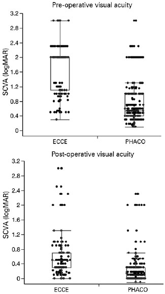 SCVAs improved in 94% and 87%, worsened in 2.6% and 7%, and remained unchanged in 2.6% and 6% of PHACO and ECCE procedures, respectively (p<0.01). Postoperative VAs was more frequently better than 0.3 logMAR (20/40) for patients in the PHACO group (85%) than it was for those patients in the ECCE group (45%) (p<0.01).