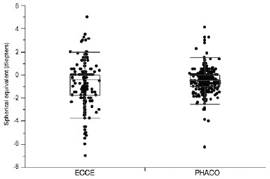 Six months after the operations, the mean SE in pseudophakic eyes was -0.52 ± 0.87 diopters for eyes in the PHACO group and -0.77 ± 1.67 diopters for eyes in the ECCE group (p=0.0024) (Figure 3).