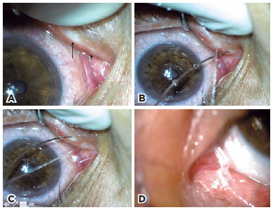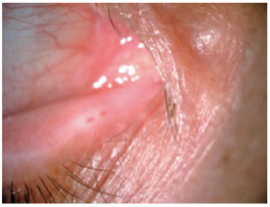 Epiphora (“dry eye”) has been previously documented in patients with accessory puncta(1-3). The occurrence of epiphora in childhood may be related to congenital anomalies of the nasolacrimal system(2,8). In elderly patients, epiphora may be associated with a dysfunction of the lacrimal drainage system, defined as functional epiphora, or acquired nasolacrimal duct obstruction(2,9). In the patient in case 2, the underlying reason for epiphora was complete nasolacrimal duct obstruction; thus, the patient underwent dacryocystorhinostomy surgery.
