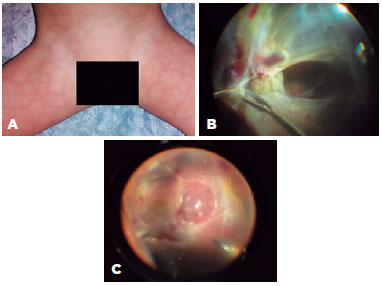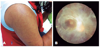 Ophthalmologic changes are rare and include congenital unilateral glaucoma (the most common ocular involvement), either associated or not to nevus flammeus and homolateral port wine stain(3,5). The etiology of glaucoma is uncertain and may be related to abnormalities of the camerular sinus (similar to the case in primary congenital glaucoma), to episcleral vein dilation similar to that occurring in Sturge-Weber syndrome, or to neovascular glaucoma secondary to retinal detachment. The treatment is variable and involves eye drops, trabeculotomy, and trabeculectomy with drainage implants(5).