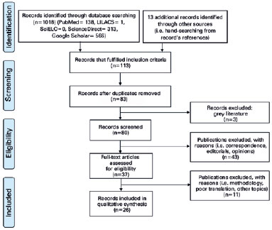 A full text assessment for eligibility was carried out for the remaining documents. Further analysis led to the exclusion of three publications which were deemed opinion pieces, four due to incoherent translation; and three others, which focused on topics outside the scope of this review. One case report was excluded as it did not fulfill the CARE checklist guidelines. Finally, 26 records were included in the qualitative synthesis: 6 literature reviews, 10 case series or cross-sectional studies, 4 case reports, and 6 intervention descriptions (miscellaneous) (Figure 1).