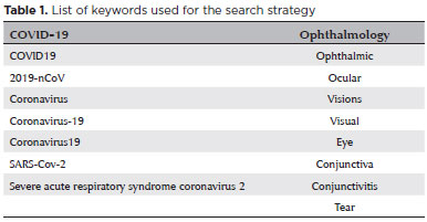 The search strategy was designed to identify studies providing data on issues related to COVID-19 and ophthalmology. The final search was conducted on April 21. Table 1 lists the keywords included in the search strategy, which were as follows: (“ophthal*” OR “ocular” OR “vision” OR “visual” OR “eye” OR “conjunctiv*” OR “tear”) AND (“covid-19” OR “covid19” OR “2019-nCoV” OR “coronavirus” OR “coronavirus19” OR “coronavirus-19” OR “SARS-Cov-2” OR “severe acute respiratory syndrome 2” OR “SARS2”). Finally, we searched the reference lists of the identified screened publications.