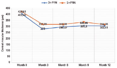 Métodos: Foram analisados neste estudo retrospectivo e comparativo 60 pacientes que não receberam tratamento prévio com edema macular e foram submetidos a injeções intravítreas de aflibercept (2 mg/0,05 mL) com pelo menos um ano de acompanhamento. Os pacientes foram divididos em dois grupos de acordo com o número de injeções intravítreas de aflibercept administradas na fase inicial. O grupo 3+PRN compreendeu 27 pacientes, enquanto o grupo 5+PRN compreendeu 33 pacientes. Os resultados visuais e anatômicos foram comparados entre os dois grupos no período inicial e aos 3, 6, 9 e 12 meses.