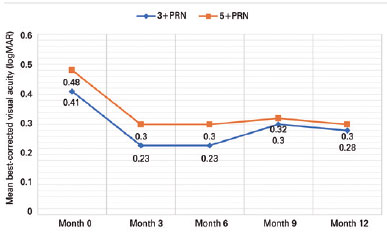 The mean baseline BCVA was 0.41 ± 0.26 logMAR (20/50) in the 3+PRN group and improved to 0.30 ± 0.26 logMAR (20/40) at month 12 (+5.5 letters; p<0.001), whereas it was 0.48 ± 0.29logMAR (20/50) in the 5+PRN group and improved to 0.28 ± 0.29 logMAR (20/40) at month 12 (+9.8 letters; p<0.001). There was no statistically significant difference between the two groups regarding BCVA improvement (p=0.453) (Figure 2).