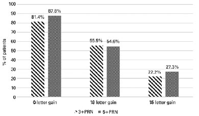 The mean letter gains were 5.5 ± 11.0 in the 3+PRN group and 9.8 ± 18.6 in the 5+PRN group at the end of the follow-up period (p=0.274). The proportions of patients who gained 10 letters or more from the baseline period to month 12 were comparable between the two groups (15 [55.5%] in the 3+PRN group versus 18 [54.6%] in the 5+PRN group; p = 0.729). Although the proportion of patients that gained ≥15 letters from baseline to month 12 was greater in the 5+PRN group, the difference was not statistically significant (6 [22.2%] in the 3+PRN group versus 9 [27.3%] in the 5+PRN group; p=0.729) (Figure 3).