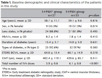 Twenty-seven patients (18 men, 9 women) were included in the 3+PRN group, whereas 33 patients (14 men, 19 women) were included in the 5+PRN group. The mean age was 58.7 ± 11.7 years for the 3+PRN group and 59.1 ± 9.6 years for the 5+PRN group (p=0.876). Both groups had comparable baseline clinical and demographical characteristics. There was a statistically significant difference in the mean number of IVA doses between the two groups (p < 0.001) (Table 1).