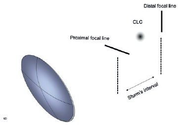 To correct astigmatism is to collapse Sturm´s interval.(4) A plus cylinder brings the distal focal line toward the proximal focal line while a minus cylinder does the reverse. In both cases, the CLC changes its position relative to the retina accompanying the displacement of the focal lines. Consequently, for each amount of residual astigmatism, a new SEa must be calculated before deciding which sphere will place the image on the retina.