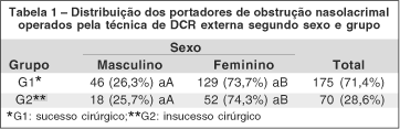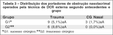 Poucos foram os pacientes com antecedentes relativos às vias lacrimais, estando o trauma orbital ou nasal presente em 5,1% dos pacientes do G1 e 8,6% dos pacientes do G2; porém, nem o trauma, nem a cirurgia nasal prévia, mostraram relação com a evolução no pós-operatório (Tabela 3).