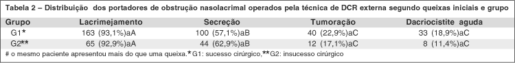 As queixas iniciais relatadas foram: epífora, secreção, tumoração e dacriocistite aguda. Houve predomínio da queixa de epífora, seguida de secreção ocular, tumoração e dacriocistite aguda. As queixas foram semelhantes em ambos os grupos, não havendo diferença estatística entre eles (Tabela 2).