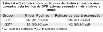Teste de excreção do corante de fluoresceína positivo ocorreu em cerca de 80,0% dos casos e o refluxo de pus à expressão foi observado em 60,0% dos pacientes. Ambos, o teste de excreção do corante e a expressão do saco lacrimal tiveram distribuição semelhante nos dois grupos (Tabela 4).