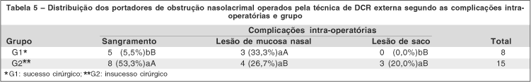As complicações intra-operatórias ocorreram em pequeno número de pacientes e foram as seguintes: sangramentos (5,3%), lesão da mucosa nasal (2,8%) e lesão de saco lacrimal (1,2%). A distribuição das complicações nos dois grupos de estudo mostrou que o G2 apresentou mais sangramento e lesão do saco lacrimal que o G1 (Tabela 5).