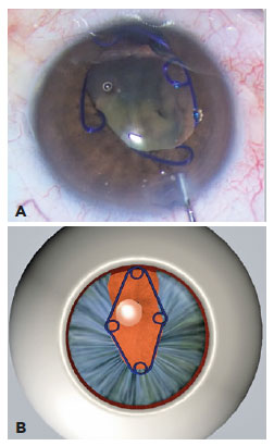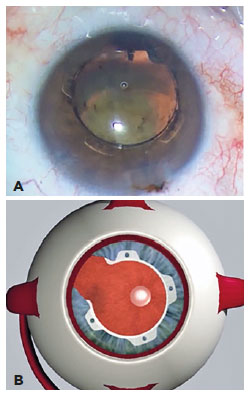 As described above, in this case, the Malyugin ring(8) was initially inserted, but one of its scrolls was released which generated forces that left the pupil off-centered (Figure 2). Among several other devices that might be considered, the Visitec I-Ring(5) device latches on to the iris at more points than are used by the Malyugin Ring but, similar to the aforementioned situation, the uneven distribution of forces may end up dilating the pupil into an eccentric position. The B-HEX® Pupil Expander, similar to other expanders that have no aperture, also tends to decentralize the pupil in the presence of an iris coloboma. The Perfect Pupil requires an incision of the cornea of at least 2.8 mm; in the presence of an iris coloboma, this device can only be used in procedures in which the primary incision is coincident with the coloboma site(9,10).