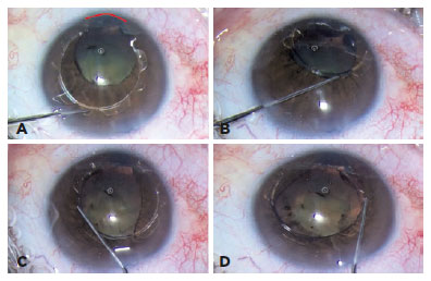 To perform the insertion, the opening is first positioned to match the iris defect; this preserves the center of the dilation and provides a uniform distribution of the force vectors regardless of the shape of the coloboma. Second, due to the arrangement of the aforementioned seven alternating indentations, the device can be adjusted and stabilized at the edge of the iris both initially and also during phacoemulsification maneuvers(10). At each end there are two small hooks which attach to the iris; this is particularly useful in cases of iris colobomata, as this permits compensation for the iris defect and the pupil remains centered. The ring attaches to the iris between the superior and inferior indentations, which facilitates stable fixation to the pupil border using the narrowest width possible. Furthermore, as in case of the iris coloboma described here, the 60o opening is particularly helpful as it may be placed in the principal incision axis or in any other direction chosen by the surgeon so that the open edge is aligned with the iris coloboma defect(10) (Figure 4).