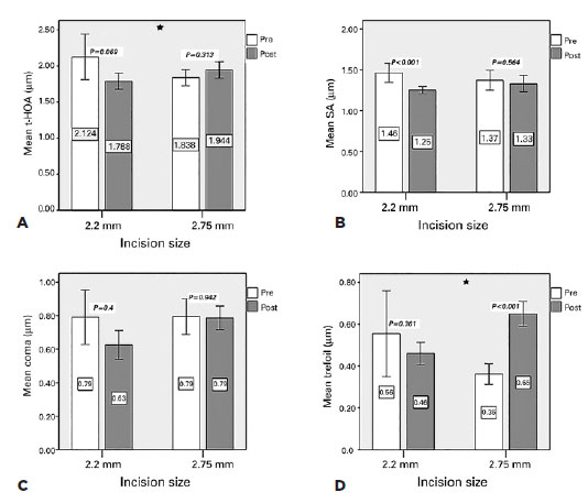 Métodos: Foram retrospectivamente revisados os prontuários médicos de pacientes que se submeteram a cirurgias de catarata com microincisões coaxiais de 2,2 mm ou com incisões coaxiais pequenas de 2,75 mm. Foram apenas incluídos pacientes com astigmatismo preexistente da córnea anterior <2,00 dioptrias (D) e ≥0,50 D, e submetidos a incisões em córnea clara com meridiano íngreme. Os desfechos primários foram aberrações da córnea anterior da 3ª à 6ª ordem com uma pupila de 8 mm. O astigmatismo da córnea anterior e o tempo efetivo de facoemulsificação foram avaliados como desfechos secundários. Os desfechos pré-operatório e pós-operatório aos 3 meses também foram avaliados.