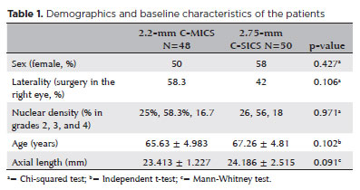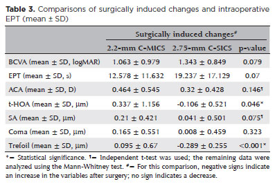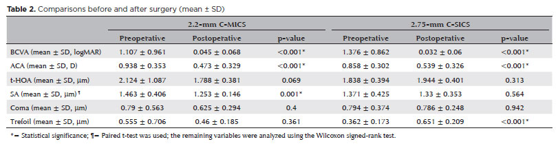Resultados: O astigmatismo da córnea anterior diminuiu significativamente após ambos os procedimentos, mas não se encontrou nenhuma diferença significativa entre os dois procedimentos quanto ao astigmatismo da córnea anterior, induzido pela cirurgia (p=0,146). Embora as aberrações totais de mais alta ordem não se tenham alterado significativamente após ambos procedimentos, a comparação entre os grupos revelou uma diferença significativa nas aberrações totais de mais alta ordem, induzidas pela cirurgia (uma diminuição de 0,337 ± 1,156 μm na cirurgia de catarata por microincisão coaxial de 2,2 mm e um aumento de 0,106 ± 0,521 μm na cirurgia de catarata por incisão coaxial pequena de 2,75 mm; p=0,046). A aberração esférica diminuiu significativamente após cirurgia de catarata por microincisão coaxial de 2,2 mm (p=0,001), mas não se alterou significativamente após cirurgia de catarata por incisão coaxial pequena de 2,75 mm (p=0,564). A aberração de coma não mudou significativamente após qualquer dos procedimentos. O trifólio não se alterou significativamente após cirurgia de catarata por microincisão coaxial de 2,2 mm (p=0,361), mas aumentou significativamente após cirurgia de catarata por incisão coaxial pequena de 2,75 mm (p<0,001). Nenhuma diferença significativa se evidenciou quanto ao tempo efetivo de faco-emulsificação entre os dois procedimentos. Houve uma correlação positiva significativa entre o astigmatismo da córnea anterior, induzido pela cirurgia e a aberração de coma na cirurgia de catarata por incisão coaxial pequena de 2,75 mm (r=0,387, p=0,006). Não foi encontrada correlação significativa entre as alterações nas aberrações totais de mais alta ordem, induzidas pela cirurgia e o tempo efetivo de faco-emulsificação.