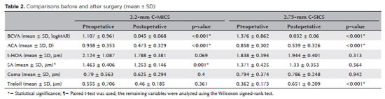 Table 3 shows that there was no significant difference in BCVA improvement between 2.2-mm C-MICS and 2.75-mm C-SICS. The reductions in ACA after the two procedures were not significantly different. There was a significant difference in surgically induced t-HOA between 2.2-mm C-MICS (decreased by 0.337 ± 1.156 μm) and 2.75-mm C-SICS (increased by 0.106 ± 0.521 μm) (p=0.046). There was no significant difference shown in surgically induced SA and coma between the two procedures. A significant difference was shown in surgically induced trefoil between 2.2-mm C-MICS (decreased by 0.095 ± 0.67 μm) and 2.75-mm C-SICS (increased by 0.289 ± 0.255 μm) (p<0.001). There was no significant difference in the EPT used intraoperatively between the two procedures.