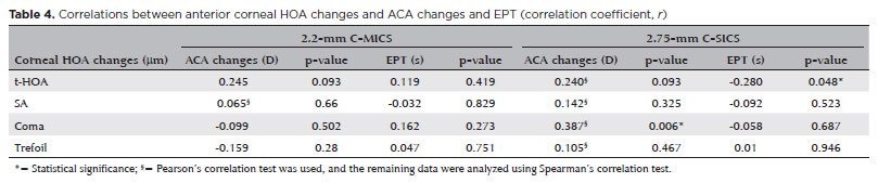 As shown in table 4, there was no significant correlation found between any corneal HOA component changes and EPT in either of the procedures, except for that observed between t-HOA changes and EPT in 2.75-mm C-SICS (r=-0.28, p=0.048). However, the p-value was at the border of statistical significance, hardly indicating a significant correlation. There was a significantly positive correlation between ACA changes and coma changes in 2.75-mm C-SICS (r=0.387, p=0.006). There was no significant correlation found between ACA changes and any other corneal HOA component changes in either of the procedures (p>0.05).