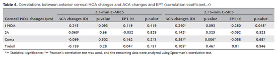 Correlations between surgically induced anterior corneal HOA changes and ACA changes and EPT