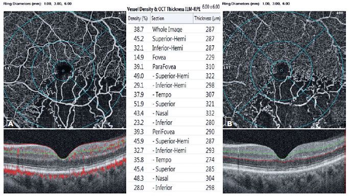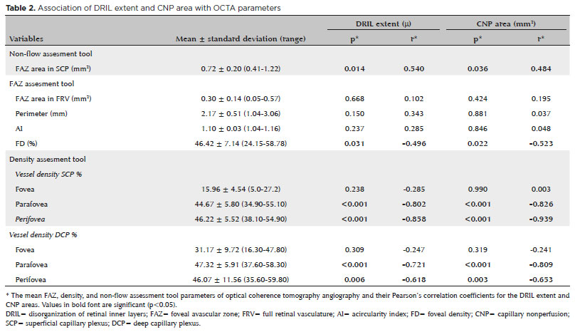 Resultados: A extensão média da desorganização das camadas internas da retina foi de 512,72 ± 238,47 µm e a área média da região sem perfusão capilar foi de 4,98 ± 2,85 mm2. Houve uma correlação positiva entre a extensão da desorganização das camadas internas da retina e a área da região sem perfusão capilar (p<0,001, r=0,901). Maior extensão da desorganização das camadas internas da retina e da região sem perfusão capilar correlacionaram-se a uma área maior da zona avascular foveal (respectivamente, p=0,014 e p=0,036) no plexo capilar superficial e a uma menor densidade foveal (a densidade vascular nos 300 µm à volta da zona avascular foveal; respectivamente, p=0,031 e p=0,022), e também se correlacionaram a uma menor densidade vascular tanto no plexo capilar superficial como no profundo, nas regiões parafoveal e perifoveal (p<0,05 em todas as correlações).