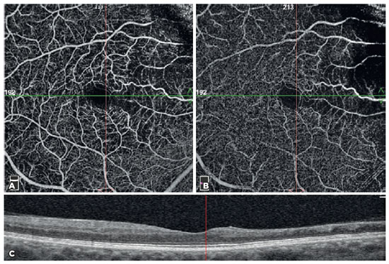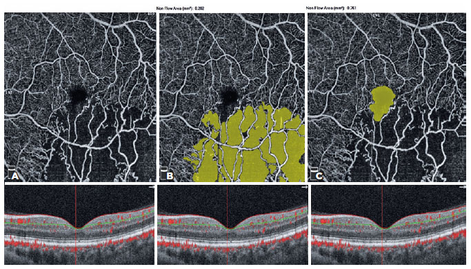 Retinal vein occlusion (RVO) is the second most common retinal vascular disease causing macular edema (ME) and an important cause of visual deterioration(1,2). Blocked venous drainage may induce an increase in the permeability of vessels and initiate a breakdown of the blood-retinal barrier. Eventually, cystoid ME, capillary nonperfusion (CNP), and ischemia occur. Ischemia is a crucial parameter in the prognosis of the disease. Traditionally, fundus fluorescein angiography (FFA) has been used to assess ischemia in these patients. Optical coherence tomography angiography (OCTA) is a noninvasive imaging technique that uses motion contrast imaging to obtain high-resolution volumetric blood flow information and generate angiographic images(3). It also allows us to quantitatively measure the CNP area and the foveal avascular zone (FAZ).