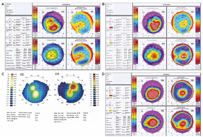 During the follow-up examination 30 days postoperatively, we observed improvements in corneal transparency and hyperemia. The OD’s corneal topographic profile showed inferior ectasia with maximum keratometry (Kmax) of 55.2 D and pachymetry thinner than 422 µm (Figure 3A). In the OS, we found an area of protrusion with a substantial increase in the inferior curvature, a Kmax of 68.6 D, and pachymetry thinner than 247 µm (Figure 3B). Pre-LASIK corneal topography was available for comparison (Figure 3C). The patient was followed for one year, and her topographic profile presented an increase in Kmax to 76.6 D without a decrease in corneal thickness at the thinnest point (278 µm) (Figure 3D). AS-OCT showed good coaptation of corneal lamellae and surgical incision, with a corneal thickness of 304 µm (Figure 2D).