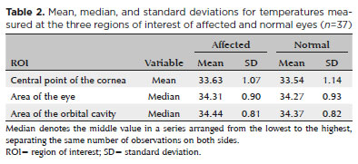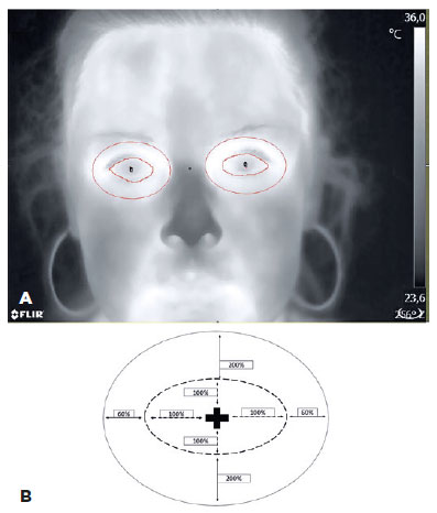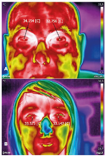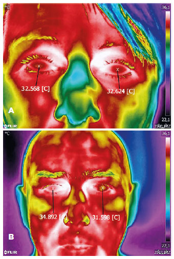 According to the analysis of the available literature, the mean temperature of the surface of the eye was 34.02ºC ± 0.22 (standard deviation [SD]). There was no significant difference found in temperature between the right and left eyes, or between males and females(6). There was no correlation between the thickness and density of the cornea, the length of the anterior chamber of the eye, and the temperature of the surface of the eye(7). Other studies did not report differences in the thermographic analysis between the left and right sides of the face(8). It is also thought that the physical characteristics of patients (i.e., body hair, obesity, and skin lesions) exert a limited effect on the acquired thermograms due to the analyzed body region(9).