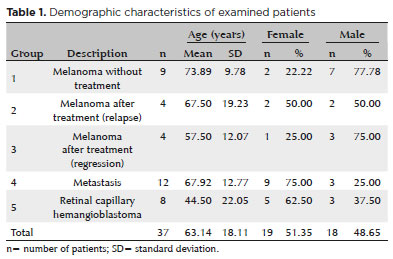 The analysis of demographic data in the studied groups revealed that intraocular hemangiomas were usually detected in younger subjects at a mean age of 44.5 years (SD: ±22.05) and more often in females; metastases and intraocular melanomas were more frequent in elderly subjects. The mean age at diagnosis was 67.92 years (SD: ±12.77) and 73.89 years (SD: ±9.78) for intraocular metastasis and uveal melanoma, respectively. Intraocular metastases and melanoma were more frequent in females and males, respectively (Table 1).