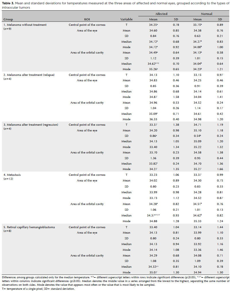 MÉTODOS: O grupo estudado compunha-se de 37 pacientes com tumores intraoculares, sendo 9 com melanoma uveal, 8 com melanoma uveal após braquiterapia com I125, 12 com metástases focais na úvea e 8 com hemangioblastoma capilar retiniano. As imagens do ponto central da córnea, da área do olho e da área da cavidade orbital foram obtidas com uma câmera FLIR T640.