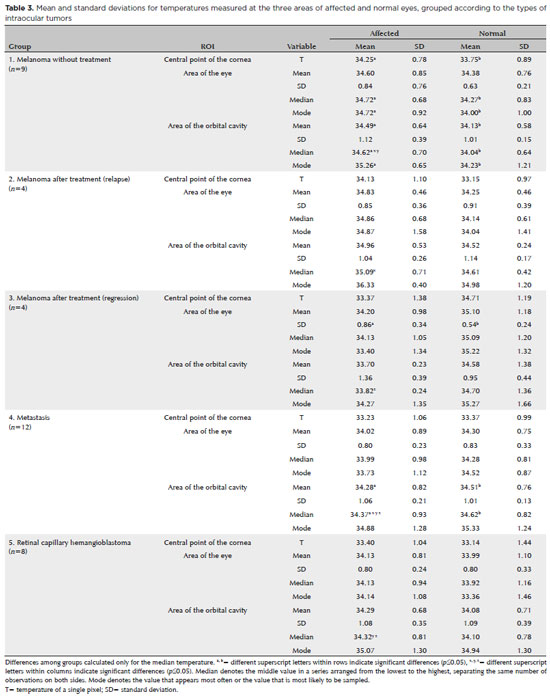 RESULTADOS: Os olhos dos pacientes com melanoma uveal tinham temperaturas mais elevadas do que as dos olhos normais dos mesmos, em toda a faixa dos parâmetros medidos nas regiões de interesse. No grupo de pacientes com melanoma após braquiterapia mal sucedida, encontrámos temperaturas maiores no ponto central da córnea. Nos pacientes com regressão do tumor, todos os parâmetros medidos foram menores no olho acometido. Encontrámos temperaturas mais baixas em toda a faixa dos parâmetros testados e das áreas medidas nos olhos com metástases na coroide. Os olhos com hemangioblastoma intraocular diagnosticado caracterizaram-se por parâmetros mais elevados nas regiões de interesse, em comparação com olhos sem essa patologia.