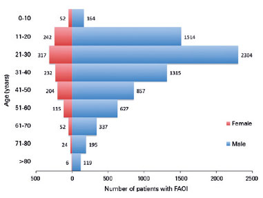 A total of 235,254 patients with firearm-associated trauma were admitted between 2008 and 2014, and 8,715 (3.7%) of those resulted in FAOI. This represented 2.75% of all ocular injuries (316,485) during this time period. When stratified by year of admission, the frequency of injuries was relatively stable, with an average of 1,245 per year (range: 1,173-1,351). The mean (standard deviation [SD]) age was 33.8 (16.9) years, with 22.6%, 70%, and 6.2% of cases classified in the pediatric (≤20 years), adult (21-65 years), and elderly (≥65 years) age groups, respectively. Males had similar mean (SD) age to women: 33.8 (17) and 33.7 (16) years, respectively. However, they had higher overall rates of FAOI (85.7% vs. 14.3%, respectively). In all age groups, males outnumbered women (Figure 1). Of all cases, Whites represented 46.6%, Blacks, 35%, and all other races, 18.4%. Hispanic ethnicity comprised 13.7%. Common locations of injury were at home (43.8%) and on the street (21.4%). Most cases were from the Southern (42.9%) and Northeast (21.5%) regions (Table 1).